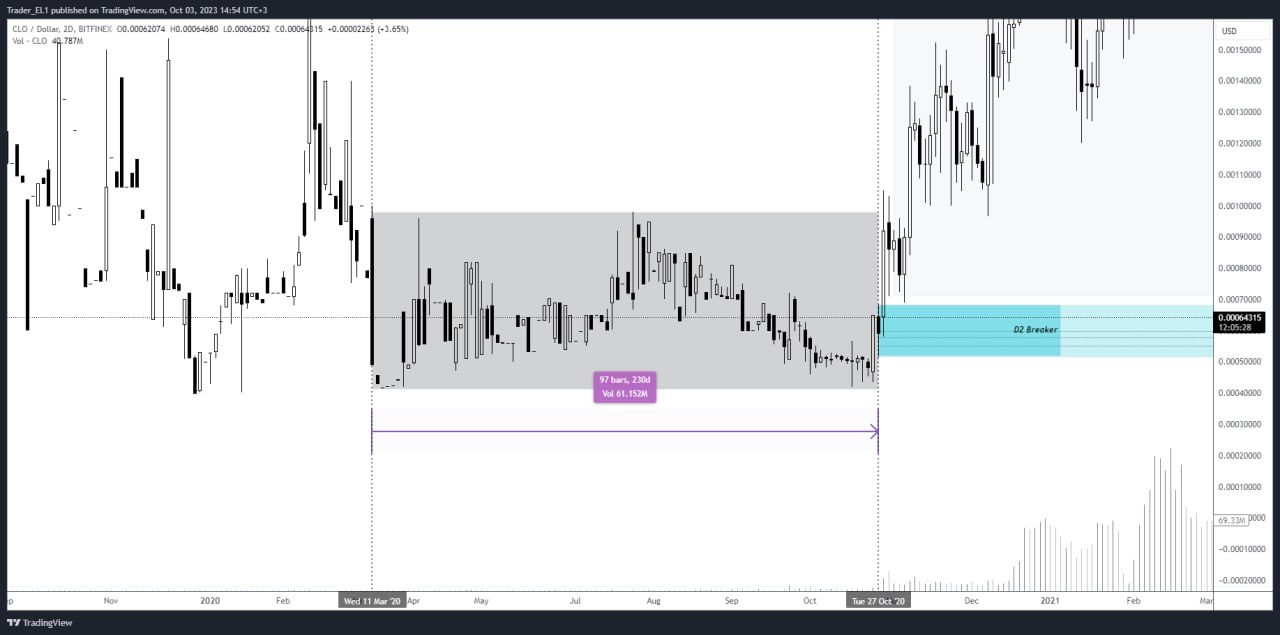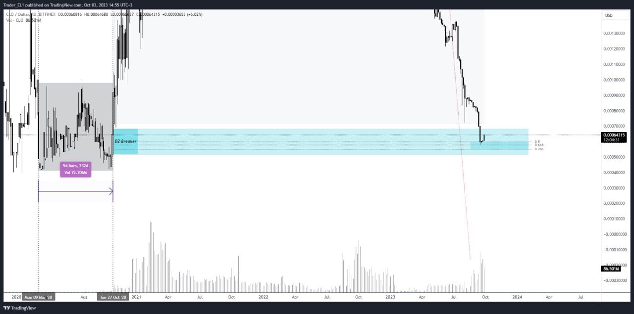 Hned ze startu si povšimneme faktu, že právě před masivním 6000% růstem ceny CLO tokenu během roku 2020 došlo k otestování zde zvýrazněné ‚breaker‘ zóny. Tato cenová oblast však nebyla otestována po celou dobu – konkrétně NIKDY od roku 2020 – až právě doteď.
