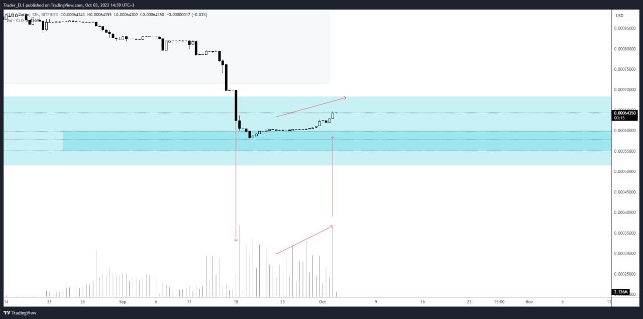 Pokud se na technickou analýzu podíváme z dnešního úhlu pohledu, vidíme, že právě nyní se cena tokenu CLO dotkla staré známé oblasti – konkrétně zóny Fib. 0.5 až 0.786. Co z toho vyplívá? Velmi pravděpodobně zde zpozorujeme odraz ceny.“
