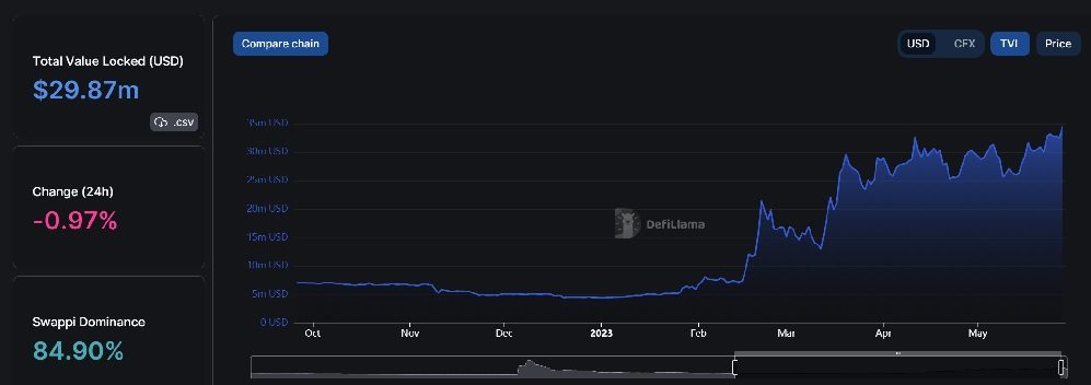 Stoupající zájem o tento projekt lze pozorovat již od startu letošního roku, což je podtrženo i růstem TVL (total value locked), tedy jednoduše řečeno peněz či likvidity tekoucí do tohoto ekosystému. Tento růst spolu s oceněním tokenu CFX během prvního kvartálu 2023 poukazuje na fakt, že je Conflux potenciálně jednou z hlavních destinací likvidity snažící se kapitalizovat na rostoucím Čínském trendu a popřípadě využít místní DeFi služby a aplikace.