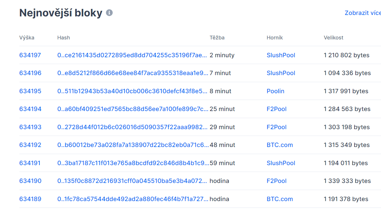 Vidíme, že poslední blok byl vytěžen před 2 minutami, předposlední před 7 minutami, předpředposlední před 8 minutami, předpředpředposlední před 25 minutami, … před 29 minutami, … před 48 minutami atd. Intervaly mezi vytěžením následujících bloků jsou tedy velmi rozdílné. V tomto případě 5, 1, 17, 4, 19 atd. minut.