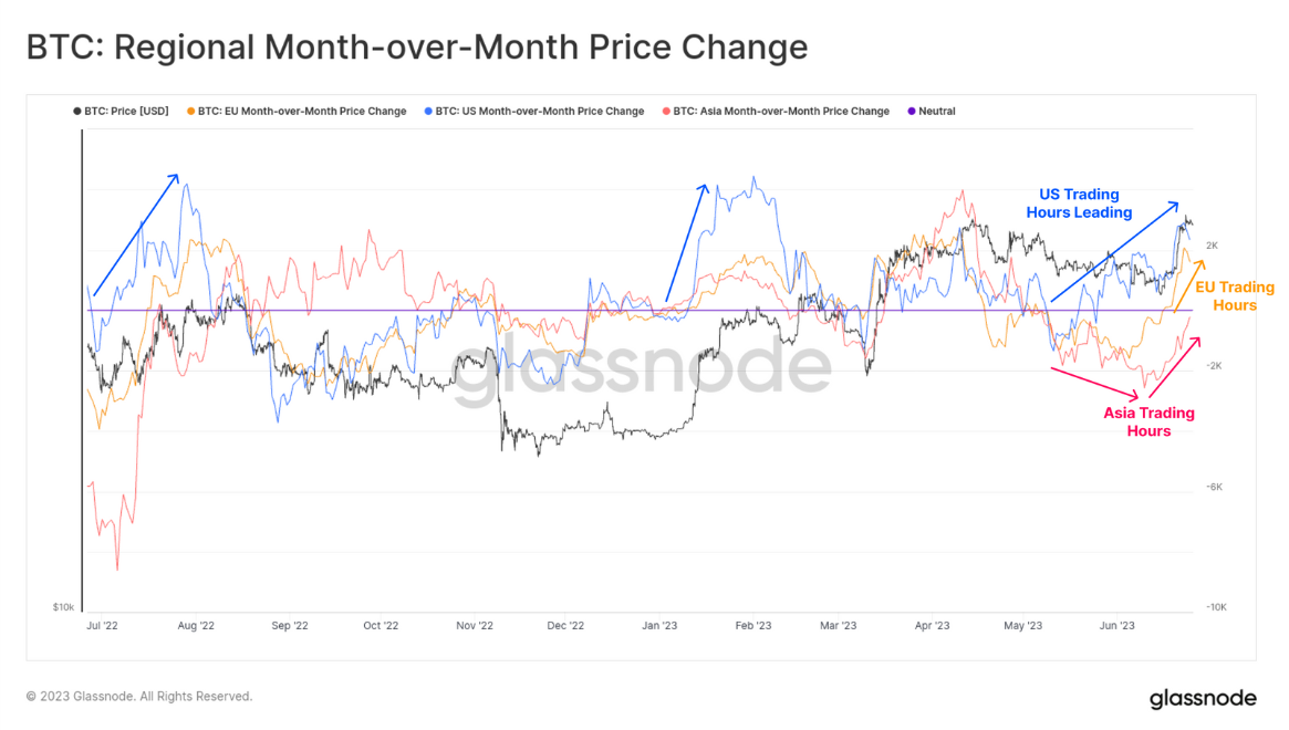 V posledních týdnech vyvíjela SEC tlak na dvě největší kryptoměnové burzy v USA, které prozatím ustupují jejím požadavkům. V posledních dnech jsme ale svědky kryptoměnové horečky, kterou zapříčinila společnost BlackRock se svou žádostí o spotové bitcoinové ETF. BlackRock je největším správcem aktiv na světě a její majetek by stačil celé České republice na sto let provozu. Po poklesu ceny na základě útoků SEC na kryptoměnové společnosti přišel opět nárůst ceny, díky podání žádosti o spotové ETF společností BlackRock. Krátce na to se cena bitcoinu vyšplhala na 31 tisíc dolarů a dosáhla letošního maxima. Nárůst ceny přišel v důsledků zvýšené poptávky po bitcoinech s tím, jak se nejrůznější investoři snaží nakoupit bitcoiny před možným schválením ETF od BlackRocku. Vzestup ceny vedli obchodníci v USA, následování nakupujícími z Evropy a nakonec v Asii. I přes sníženou poptávku po kryptoměnách ve Spojených státech a regulacím ze strany SEC se zdá, že v USA je kryptoměny stále největší zájem. Naopak v Asii se tato metrika sleduje jen těžko, protože přísné zákony často nutí investory nakupovat tajně.