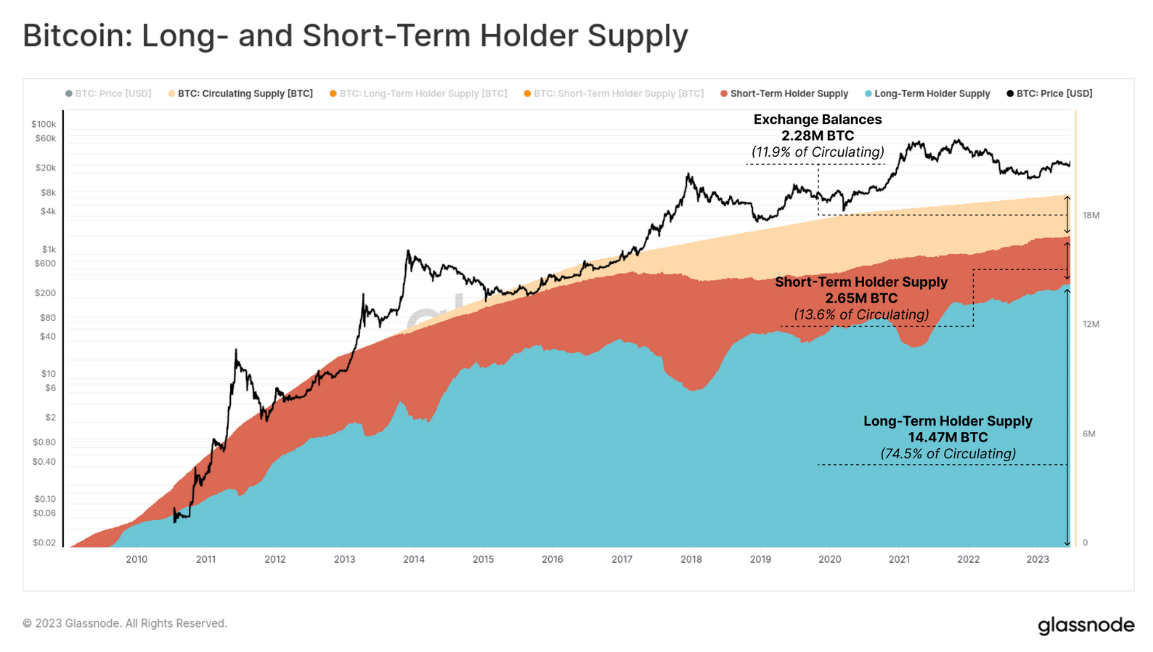 Analýza toku finančních prostředků u největších burz ve Spojených státech a Asii ukazuje nárůst akumulace objemů obchodování v Asii. Americké trhy vykazují v roce 2023 slabší poptávku oproti předchozím rokům, což můžeme zřejmě přisuzovat boji SEC, která se snaží omezit kryptoměnový trh v USA. Predikce některých odborníků se tedy zřejmě vyplňují, protože asijský trh může být jedničkou v kryptoměnovém průmyslu, zatímco Spojené státy ztratí své prvenství kvůli přísným regulacím. Také analýza krátkodobých držitelů v roce 2023 ukazuje, že psychologie trhu opustila medvědí narativ z roku 2022. Právě krátkodobí držitelé a burzy jsou pro následující analýzu důležití, protože jsou to právě oni, kdo poskytují likviditu na trh. Naopak dlouhodobí držitelé hromadí své prostředky na peněženkách a zpět do oběhu je vrací jen zřídka. Tento typ investorů postupně přibývá, protože s přísnými regulacemi a nařízeními ze strany SEC přestává být bezpečné držet kryptoměny na burzách. Stále více lidí tedy stahuje své prostředky na soukromé peněženky, ke kterým vlastní privátní klíče a nikdo jim je nemůže zabavit.