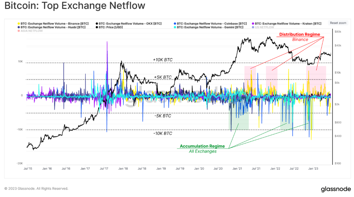 Pro zhodnocení dostupnosti bitcoinů využil Glassnode finanční toky na největších burzách ve Spojených státech a Asii. Data pochází z CoinGecka a ukazují tři největší burzy pro každý region. Ve Spojených státech je to Coinbase, Kraken a Geminy a v Asii je to Binance, OKX a Huobi. Největší odliv zaznamenaly všechny tyto burzy během bear marketu 2020 - 2021, kdy problémy se stablecoinem Luna a pádem burzy FTX přesvědčily řadu uživatelů ke stáhnutí aktiv z burz. Většina burz v tomto období zaznamenala denní odlivy bitcoinů od 5000 do 10000 BTC. Binance v tomto období ale zaznamenal nárůst likvidity v důsledku přesunů aktiv z FTX a menších burz na největší burzu na světě, kterou většina uživatelů vnímala jako bezpečnou. To lze pozorovat na následujícím grafu, kde žlutá barva patří právě Binance, na kterou přitekly desítky tisíc bitcoinů z jiných burz.