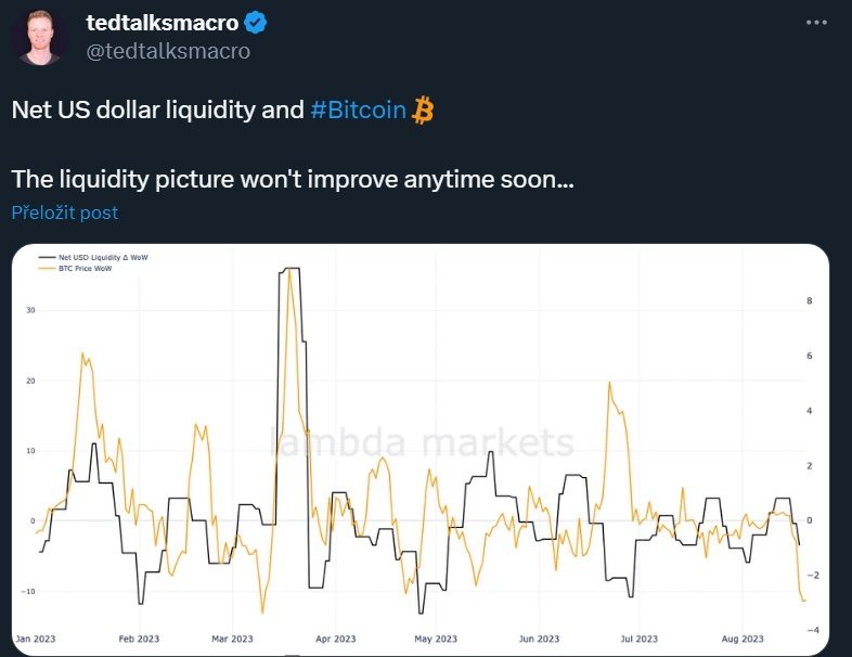 Od ledna likvidita pozitivně ovlivnila cenový vzestup BTC a rizikových aktiv, avšak situace se může měnit. Oznámení amerického ministerstva financí o rozšíření emise dluhu do druhé poloviny roku může z trhů vyčerpat více likvidity, než se očekávalo. Tato změna v kombinaci s delším obdobím emise a pokračujícím zvyšováním sazeb ze strany FEDu může způsobit napětí v situaci ohledně likvidity v USA, což by mohlo vést k větší nejistotě a potenciálně nižším hodnotám pro BTC a akcie v nadcházejících měsících.“ TedTalksmacro