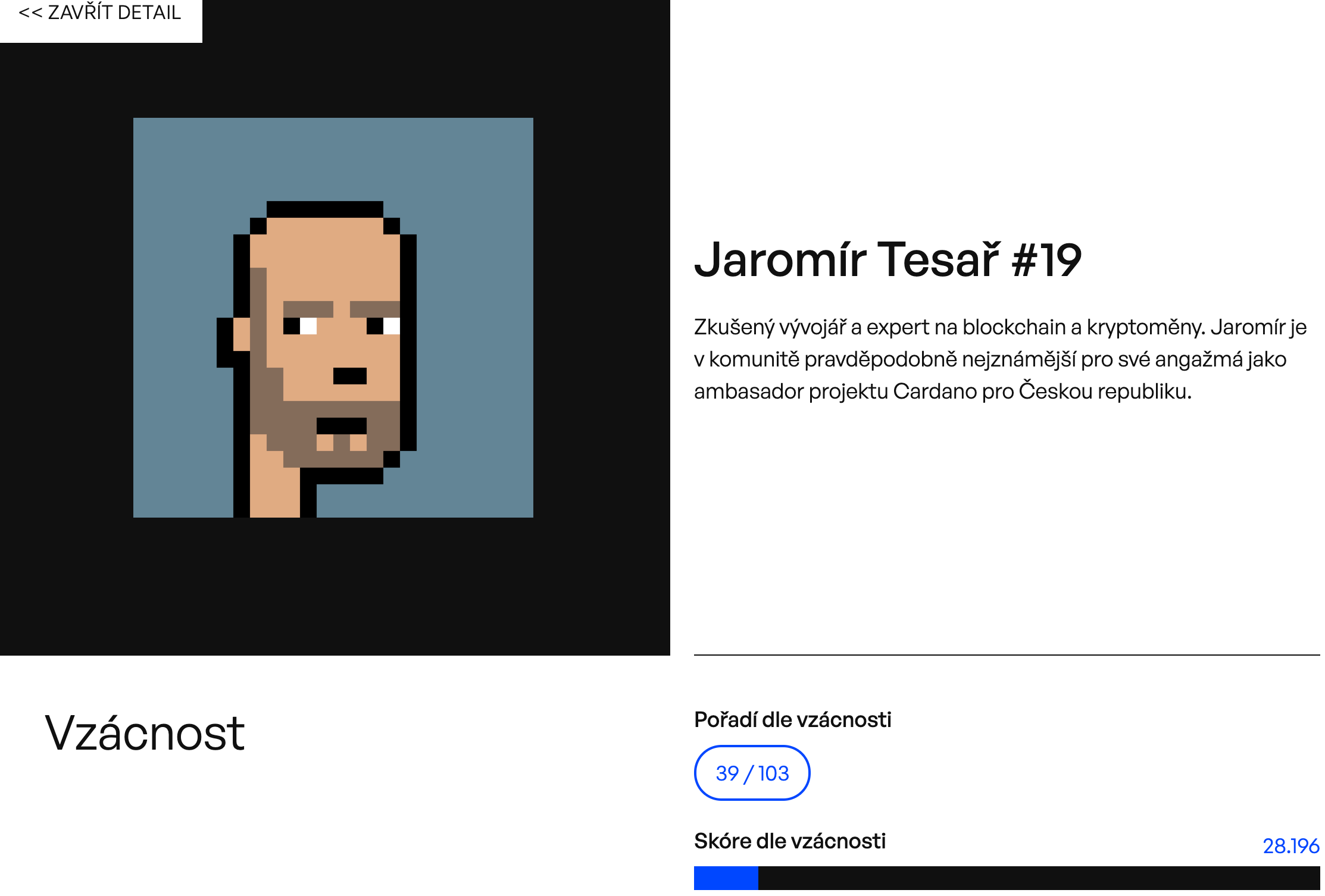 Co od projektu očekávat? Rozhodně bude zajímavé sledovat, jaký zájem o NFT bude. Nějak si nedokážu představit, že někdo touží digitálně vlastnit NFT s odkazem na reálnou osobnost. Tím spíš, když napojení na konkrétní osobnost ve fyzickém světě v podstatě neexistuje. Co by z toho daný člověk měl kromě toho, že podpoří rozvoj komunity? Autoři slibují uspořádání akce, kam budou moci přijít jen držitelé NFT. To zní zajímavě. Kdyby se podařilo na událost pozvat také některé pankáče, bylo by to rozhodně zajímavé setkání. Chci se potkat s někým, kdo drží NFT se mnou s vědomím, že za to majitel zaplatil třeba 1 ETH? Vlastně nevím, ale nakonec proč ne. Teoreticky si mohu NFT s mým vyobrazením koupit sám a díky tomu se dostat na akci, kde se možná potkám s dalšími pankáči. Možná by nám to umožnilo setkání, ke kterému by jinak možná nikdy nedošlo. Osobně jsem zvědavý, jestli bude o NFT zájem a kolik za ně budou lidé ochotni zaplatit. Může to být považováno jako určitá forma hodnocení jednotlivých pankáčů. Někteří z nás možná zůstanou na ocet. O jiné může být velký zájem. Cena se může v čase měnit. Určitou roli může sehrát náklonnost pankáčů k jednotlivým projektům. Mezi pankáči jsou Bitcoin maximalisté, kterým se nemusí líbit, že budou zvěčněni zrovna na Ethereu. Nečekám, že se Bitcoin maximalisté začnou učit, jak fungují NFT na Ethereu a budou utrácet své milované Saty za jiného maximalistu v digitální podobě. Každopádně i v tomto ohledu považuji projekt za zajímavý experiment. Podle některých expertů bude budoucnost patřit komunitám. Ty budou důležité při zavádění nových produktů a služeb. Lidé ve státě se dají považovat za určitou komunitu, která sdílí hranice, zvyky, kulturu, jazyk, peníze a mnoho dalších věcí. Nicméně díky internetu se začaly formovat zcela nové komunity, které neznají hranice. Tyto komunity můžeme najít na sociálních sítích jako Facebook, Twitter, atd. Kryptoměnové komunity jsou skupiny lidí, kteří sdílejí názory a postoje navzdory tomu, že mluví jinou řečí a žijí v různých státech po celém světě. Blockchain, NFT a decentralizovaná digitální identita mohou sehrát klíčovou roli v rozvoji tohoto fenoménu. Tím spíš, když se IT gigant Facebook rozhodl vytvořit Metaverse. IT giganti nemohou vlastnit Metaverse a bez decentralizace to v podstatě nedává smysl. Lidé mají Metaverse spojený s brýlemi na očích a 3D světem, do kterého lze vstoupit a vystoupit z něj. Tak daleko se v této dekádě nejspíš nedostaneme. Z mého pohledu je Metaverse hodně vzdálený cíl, který si nejspíš plně užijí až naše děti. Určitá transformace internetových služeb a přechod z architektury klient-server na Peer-to-Peer komunikaci pro začátek stačí. Blockchain nabízí něco, co současné na serverech založené služby nabídnout nemohou. Neomezenou možnost vytvořit novou hodnotu a tu následně výhradně vlastnit a přenášet ji. Vše bez prostředníků. Tohle musí být klíčová vlastnost nové verze Internetu, nebo chcete-li Metaversu, za dalších 10 až 20 let. Pokud se tak stane, bude to mít nedozírný dopad na současné sociální a finanční služby. Fyzický svět se bude nadále více prolínat se světem digitálním. Pokud budeme používat decentralizované peníze, přijde na řadu decentralizované identita a s tím nevyhnutelně nové formy sociálních uskupení. Centralizace spojená s chamtivostí je jedním ze zdrojů současným problémů. Je vlastně jedno, na jaký sektor se podíváme. Pokud ho budeme analyzovat, téměř vždy dojdeme k podobnému poznání. Platí to také pro mediální svět, kde bojujeme s cenzurou, fake news, zneužívání dat uživatelů a ztrátou soukromí, záměrnému štěpení společnosti na znepřátelené tábory, atd. Velcí IT giganti si v době amerických prezidentských voleb dovolili cenzurovat Donalda Trumpa, a tím v podstatě světu ukázali, kdo je tady pánem. Facebook, Twitter a další sociální média mají díky svému síťovému efektu reálnou moc. Budování Metaversu je pouze další pokus o posílení jejich pozic. Technologie si své cesty vždy najde. Americké vládě se podařilo Facebooku zakázat projekt Libra/Diem. Metaverse chápu jako další pokus z jiné strany. Nikdo nedokáže v tuto chvíli říct, jestli je NFT technologie cestou k lepším zítřkům. CzechPunks je průkopnický projekt. Může uspět, nebo ukázat slepou uličku. Snad všem dobře známý Jára Cimrman vynikal jako pionýr slepých uliček. Každá slepá ulička pomůže přispět k nalezení té správné cesty. S Bitcoinem to bylo úplně stejné. Na začátku měl své zastánce i odpůrce. Narativ si prochází určitou transformací a neřekl bych, že jsme u konce. Zkuste se 10 pankáčů zeptat co je pro ně Bitcoin a možná se dočkáte 10 dost odlišných odpovědí. Mimochodem, co tak z těchto odpovědí udělat další NFT? Jsme stále na začátku. Nové projekty a jejich možnosti přitahují jiné skupiny lidí a trajektorie adopce jsou velmi podobné té bitcoinové. Když vidím, kolik emocí CzechPunks budí, jsem si téměř jistý, že jsme na správné cestě. Nemá smysl porovnávat NFT optikou bitcoinů. Větší smysl má analyzovat reálné problémy a hledat vhodné řešení. Bitcoin rozhodně nevyřeší problémy s cenzurou médií. Kryptopankáči budou na Ethereu nesmazatelně zapsáni navždy. Za 50 let se uvidí, jaký to bude mít význam. NFT, respektive tokenizace jako taková, v nějaké formě přijde. Vnímám to jako logické pokračování Bitcoinu. Současný stav je neutěšený, neboť chybí regulace a právní rámec, poplatky jsou drahé, škálovatelnost nedostatečná, UI by mohlo být lepší a adopce vyš