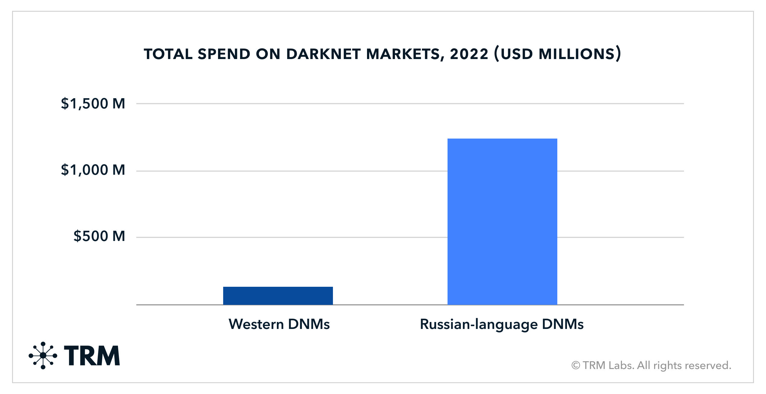 Obchodování s drogami se v naprosté většině případů odehrává na darknetových tržištích, která není třeba více představovat. Jedním z těch nejslavnějších bylo tržiště Silk Road, po jehož zavření zabavila americká vláda desítky tisíc bitcoinů, které se letos chystá prodat. Podle průzkumu společnosti TRM Labs bylo v roce 2022 na darknetových tržištích utraceno celkem 1,49 miliardy dolarů. Více než 80 % těchto prostředků bylo utraceno na nelegálních tržištích v ruském jazyce. Největší existující tržiště fungující na západě pod názvem ASAP Market zpracovalo jen 10 % tržeb na globálním trhu. Ukázalo se také, že většina ruskojazyčných darknetových tržišť přijímá pouze bitcoin, zatímco západní klienti raději používají Monero, které je daleko anonymnější. Následující graf ukazuje podíl ruskojazyčných tržišť (Russian-language DNMs) a západních tržišť (Western DNMs - DarkNet Markets).
