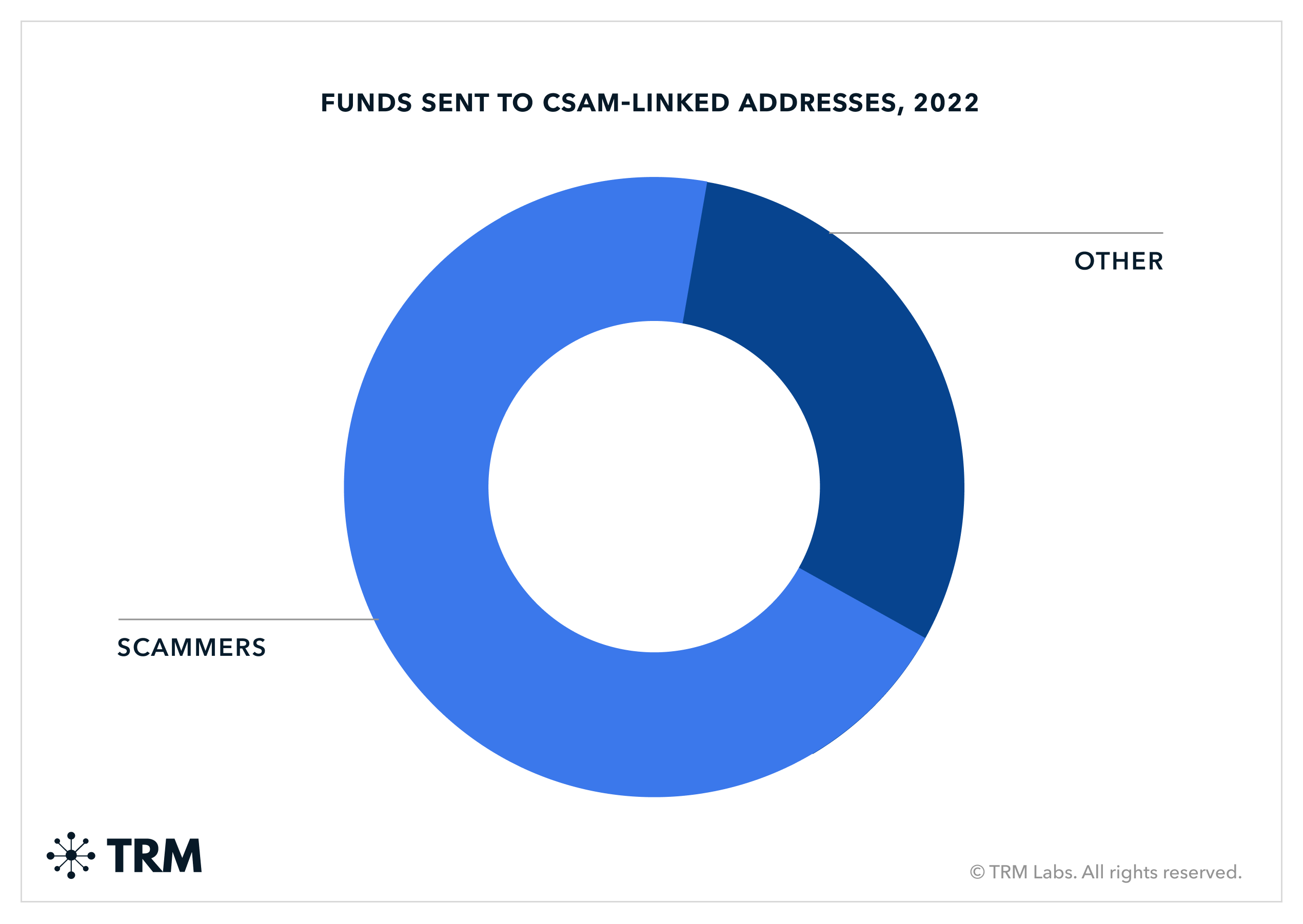 Společnost TRM analyzovala více než 3 miliony dolarů odeslaných na kryptoměnové peněženky spojené s prodejem sexuálního materiálu s dětmi během roku 2022. Zajímavé ale je, že více než dvě třetiny těchto plateb bylo provedeno na peněženky podvodníků, kteří za poplatek nabízejí přístup k takovému materiálu. Ve skutečnosti se ale jedná pouze o podvod a kupující naštěstí žádný nezákonný materiál nezíská. Tento velký podíl podvodů může naznačovat to, že praví šiřitelé tohoto zakázaného materiálu operují skrytě a nabízejí své služby pouze lidem, kteří na ně získají kontakt. Studiem těchto transakcí mohou vyšetřovatelé získat informace o pravidelných nakupujících i prodejcích. Následující graf ukazuje poměr podvodných transakcí (Scammers) a ostatních, které by mohly končit předáním nelegálního materiálu (Other). Jde ale o pornografii zachycující děti, každý okradený "zákazník" si to tedy stokrát zaslouží.