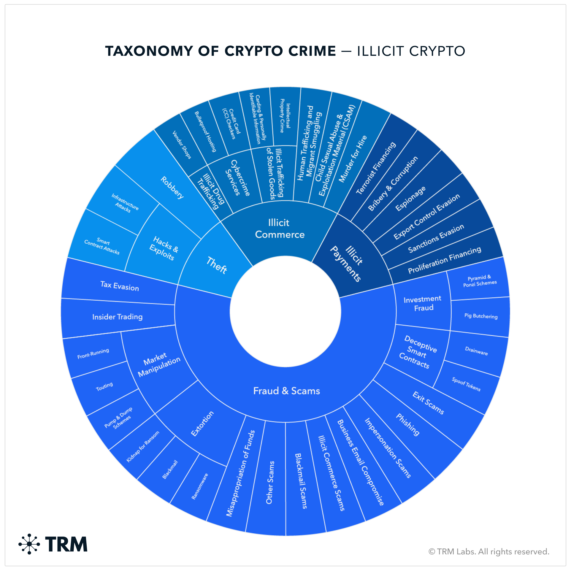Díky analytickým společnostem zpracovávajícím velké množství dat můžeme čas od času zhodnotit, jak se kryptoměny používají pro platby za trestnou a nelegální činnost. Přestože fiat měny, v čele s americkým dolarem, dominují nelegálním transakcím, i kryptoměny používají zločinecké organizace po celém světě. Řada kryptoměn je ale transparentní co se transakcí týče a je možné sledovat některé zločince a jejich používání kryptoměn. Velice přínosné jsou kryptoměny také pro vyšetřovatele, kteří jsou schopni sledovat řetězec transakcí zločineckých organizací. Díky tomu mohou odhadovat strukturu a fungování organizace. Analytická společnost TRM Labs zpracovala data ohledně nelegálních obchodů a kryptoměn a vypracovala zajímavou studii.