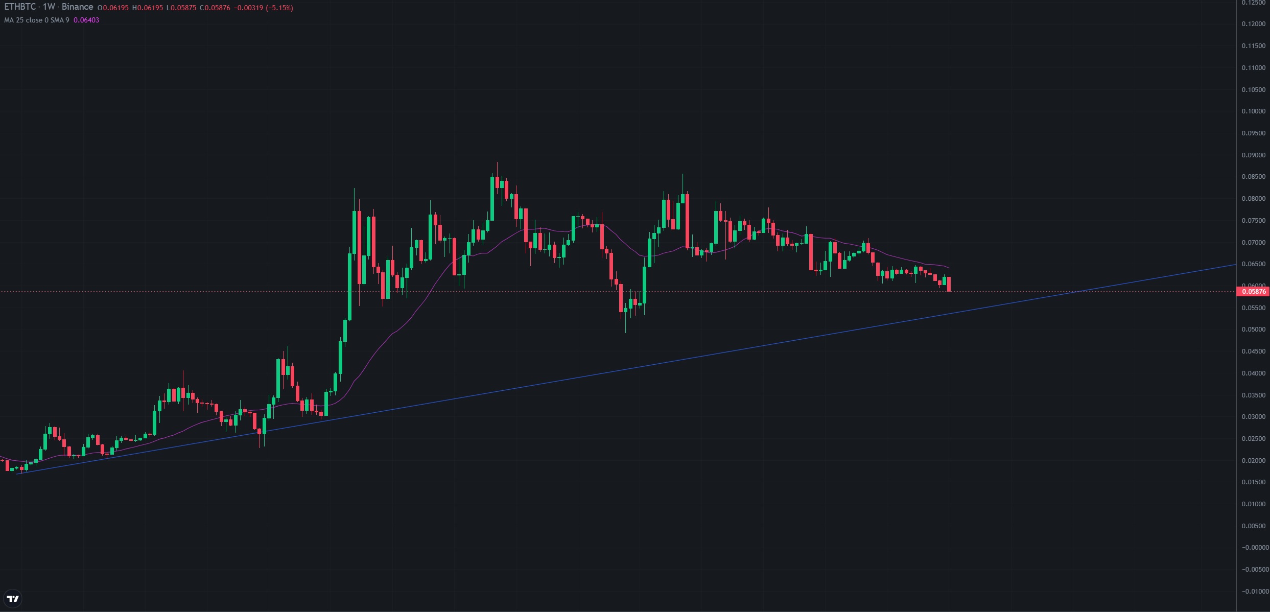 ETH/BTC projevuje slabost (odraz nebo blížící se krach altcoin trhu?):