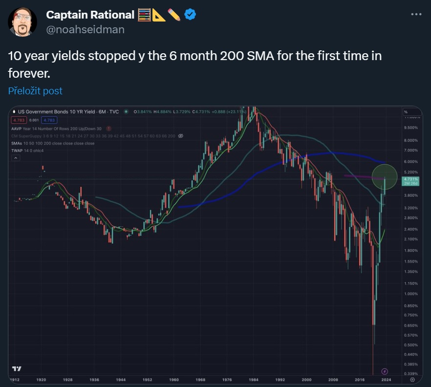 Výnosy 10letých státních poprvé v historii narazily do resistence 200SMA